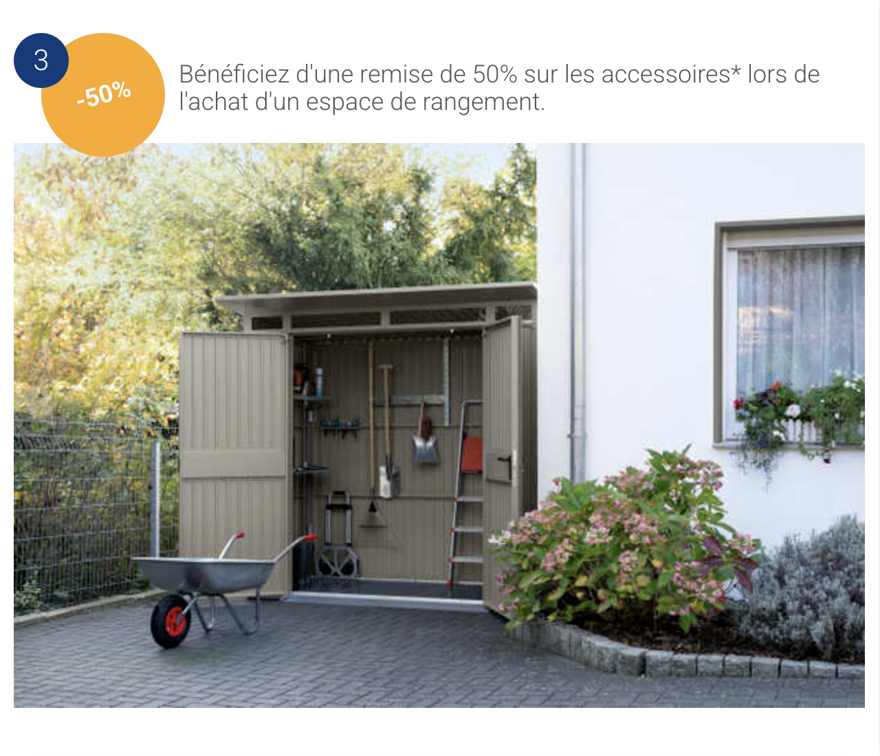 Du 1er au 31 octobre 2025, bénéficiez de 50% de remise sur tous les accessoires lors de l’achat d’un espace de rangement. Profitez-en pour personnaliser votre abri selon vos besoins : étagères, supports muraux, crochets, et bien plus encore.